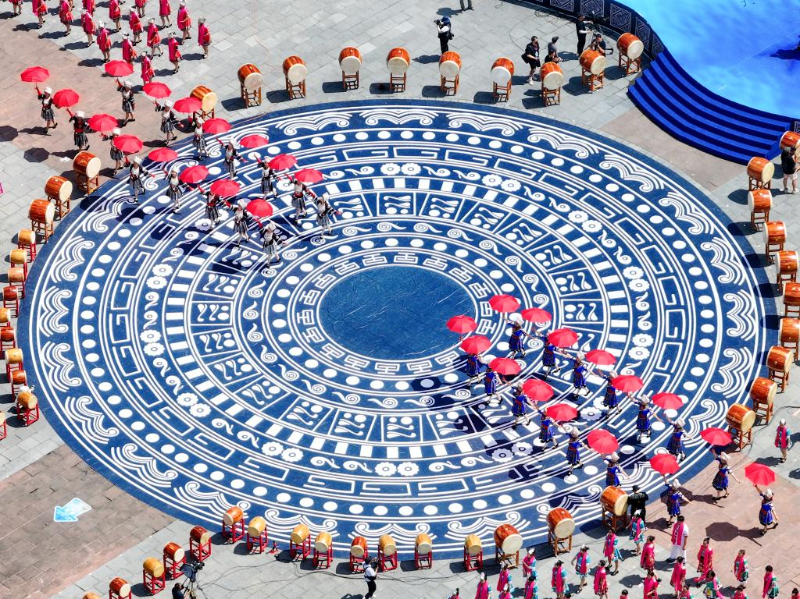 5月15日,苗族同胞在传统节日踩花山节上载歌载舞(无人机照片)。新华社记者 唐奕 摄