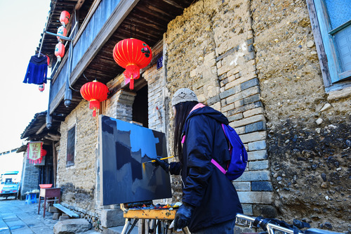 一名旅行画家在福建省武夷山市五夫镇的街巷内写生。新华社记者李芒茫摄