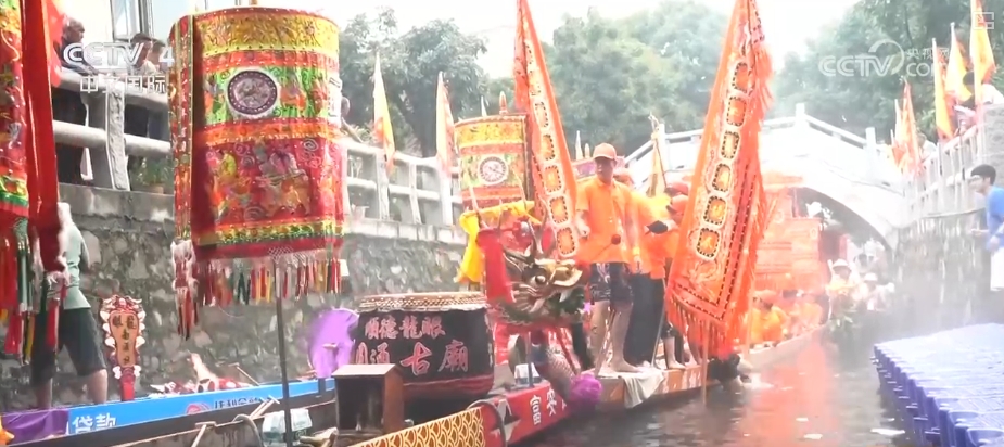 点睛后的龙舟纷纷驶入河涌,龙舟队员敲锣打鼓、摇龙头、扯龙尾,齐心协力摁龙舟。龙舟在一上一下的律动中荡开层层水花,展示龙舟及队员的风采和气势。人们互祝端午安康、身体健康。