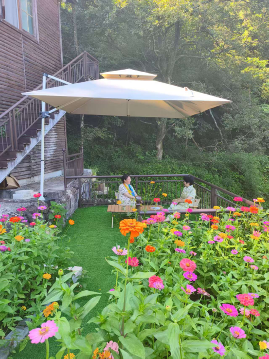 拍完美照,我们继续向深山进发。不远处,一座北欧风格的建筑和一处山野咖啡民宿吸引了我们,大家随即下车。在山野咖啡宿营地,我们意外得知营地主人是江苏淮安人——竟是老乡!老乡热情接待了我们一行,我们愉快交谈、合影留言,中午还一起共进午餐。宿营地对面,便是那座北欧风格的洋楼,穿过防空洞就能到达。绿色山体中的欧式小洋楼格外显眼,美得让人挪不开眼,我们举起手机又拍了一阵。随后,我们走进这幢小洋楼,内部布置得极其舒服温馨,大家在这里看书、聊天、拍照、休闲,惬意了好一会儿。之后,我们又去附近的黄山别墅转了转,那里风景如画,空气清透。转完后,我们便准备返程,与徐老师夫妇及江苏老乡等友人一一告别,结束了两日之旅,直奔扬州。