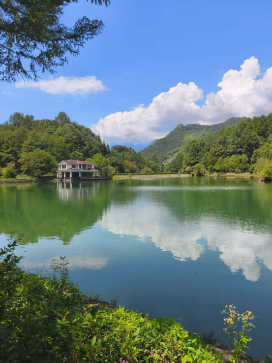 第二天,我们早早用过早餐,退了房,继续出发寻访。车行约三十多公里,一处美景突然吸引了我们,大家赶紧下车。只见山脚下的河塘在蓝天白云映衬下,美得让人怀疑人生——这难道是天上人间?如此仙境,仿佛只该出现在幻觉或梦境中。没想到黄山深处的森林里竟藏着这样的景致,我们惊喜不已。河塘对岸,木结构的民宿与树木相映,宛如“在水一方”;水面上的房屋、云彩与它们的倒影交相辉映,大自然的魅力令人沉醉。我们赶紧抓拍美景,女生们也美滋滋地摆起姿势拍照。随行的徐老师是视频和抖音制作高手,第一时间给美景配上文字与背景音乐,发布到抖音分享。
