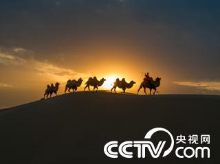 内蒙古通辽:大漠夕阳斜照 驼队暮归