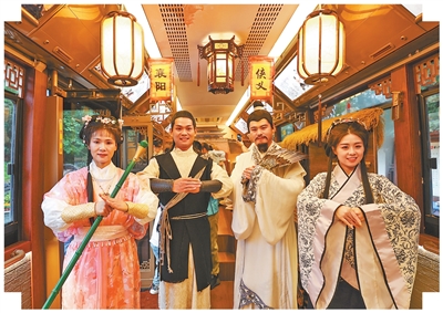 10月5日,湖北襄阳,“黄蓉”“郭靖”“诸葛亮”“黄月英”(从左向右)在“侠义襄阳”旅游公交上与游客互动。