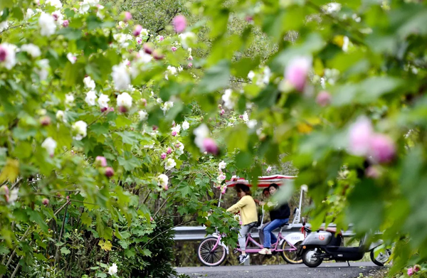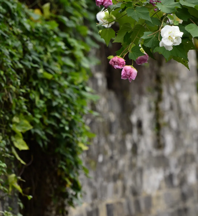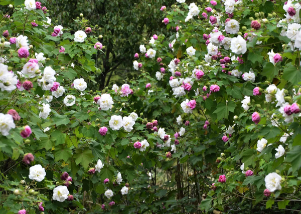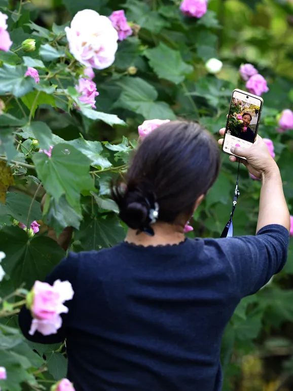 粉白相间的花瓣带着清晨的露珠,在微风中轻轻颤动,时而娇羞如少女,时而明艳似云霞。不同于春日花卉的娇嫩,秋冬的芙蓉更添了几分坚韧,哪怕气温渐凉,依旧热热闹闹地开着,为小岛织就了一层浪漫的花帘。