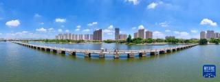 这是2021年7月8日游客在福建泉州晋江古石桥安平桥上游览(无人机照片)。安平桥位于福建晋江与南安之间,建于1138年的跨海梁式石桥,因长度又被称为五里桥。总长2000多米,桥墩300多个,其长度在12世纪中叶堪称举世无双,有“天下无桥长此桥”之说。