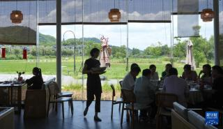 7月3日,在汪巷村建在稻田间的初新农庄,服务员在给客人上菜。