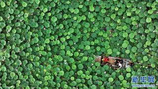 在山东省郯城县马头镇东圣街“荷花湾”,游客乘船观赏绽放的荷花(无人机照片)。(房德华摄)