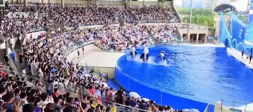 在上海的一家海洋公园里,虎鲸戏水表演正在进行,虎鲸时而跃身击浪,或是以尾鳍拍击水面,引得坐席上的观众欢呼声不断。