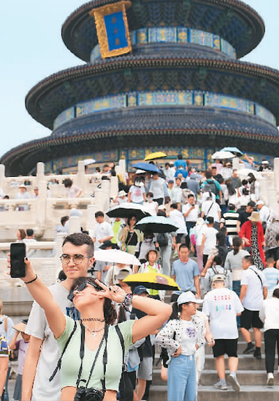 两名外国游客在北京天坛公园祈年殿前自拍合影。 新华社记者 鞠焕宗摄