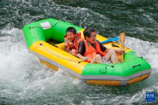 7月22日,游客在安徽省黄山市休宁县夹溪河漂流消暑。
