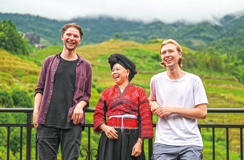 广西桂林市龙胜各族自治县龙脊镇大寨村村民潘凤兰(中)在她家民宿外和两位德国游客交流(六月二十六日摄)。新华社记者赵子硕摄