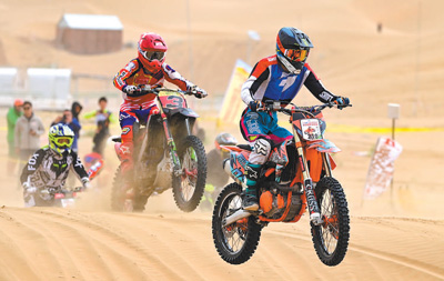 户外运动爱好者在内蒙古鄂尔多斯市杭锦旗参加摩托车沙漠越野场地赛。王 正摄(人民视觉)